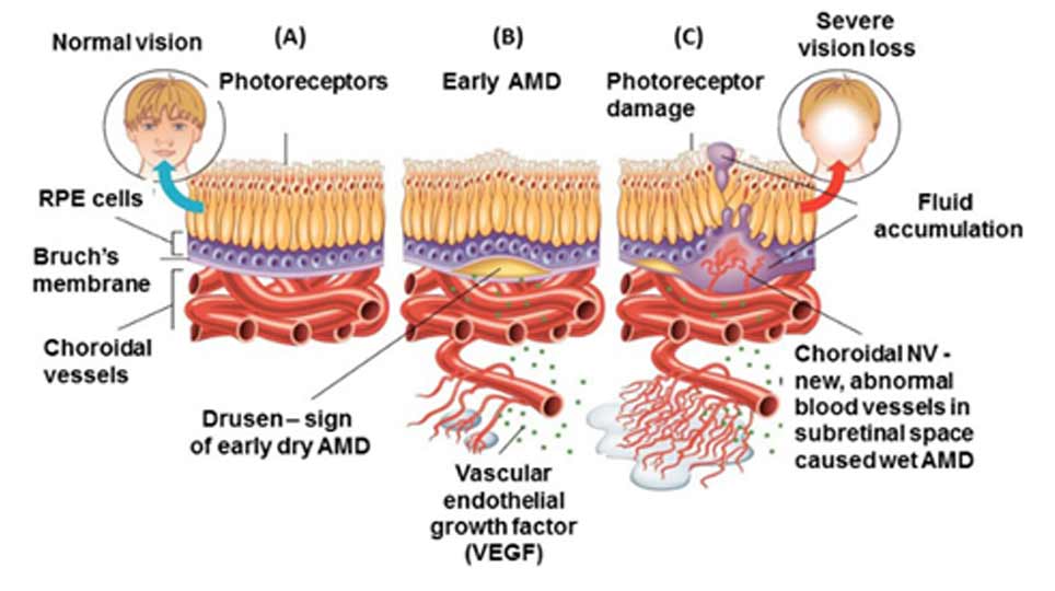 With ageing, the RPE layer becomes weak and slowly loosing its watertight feature. When this happens, blood vessels from the choroidal layer will pass through the RPE to get into the retinal layer.